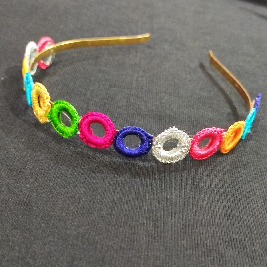 This handmade multicolour hairband showcases intricate mirror work, adding a vibrant and traditional touch to any young girl's outfit. Designed specifically for kids, it offers a comfortable fit while enhancing festive and casual looks with its detailed craftsmanship. Perfect for special occasions or everyday wear, this accessory combines style with cultural elegance.