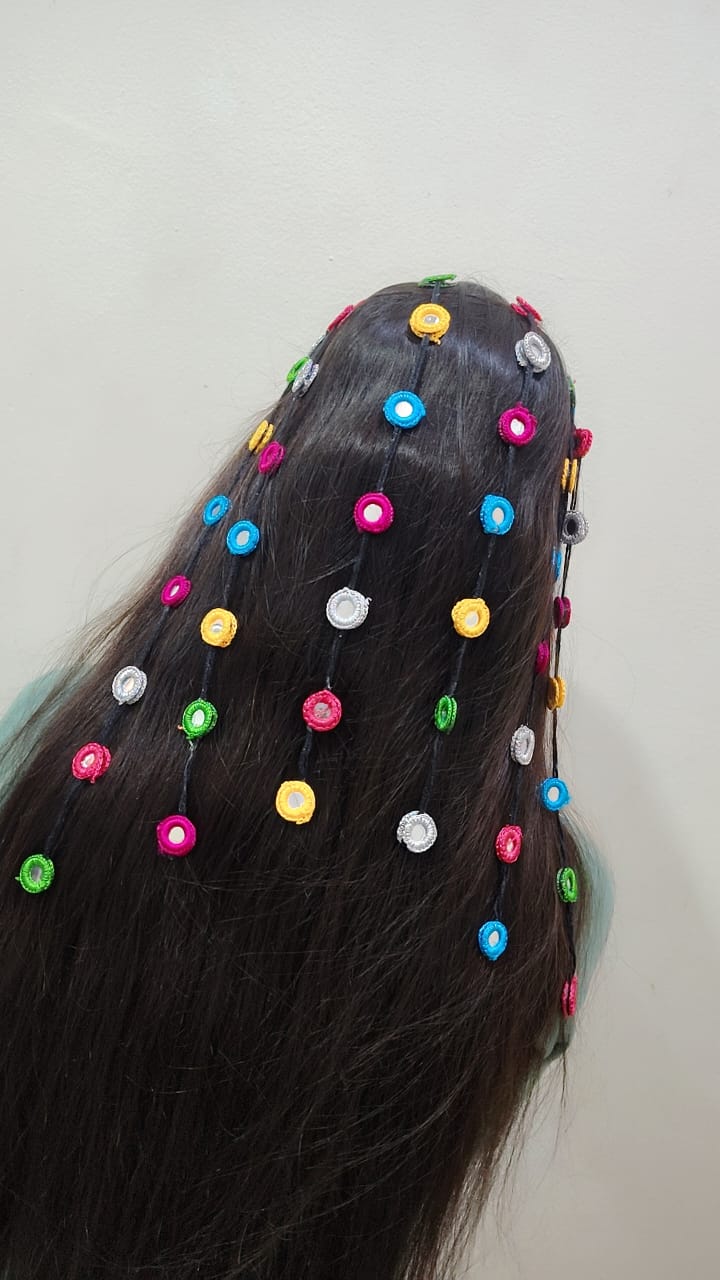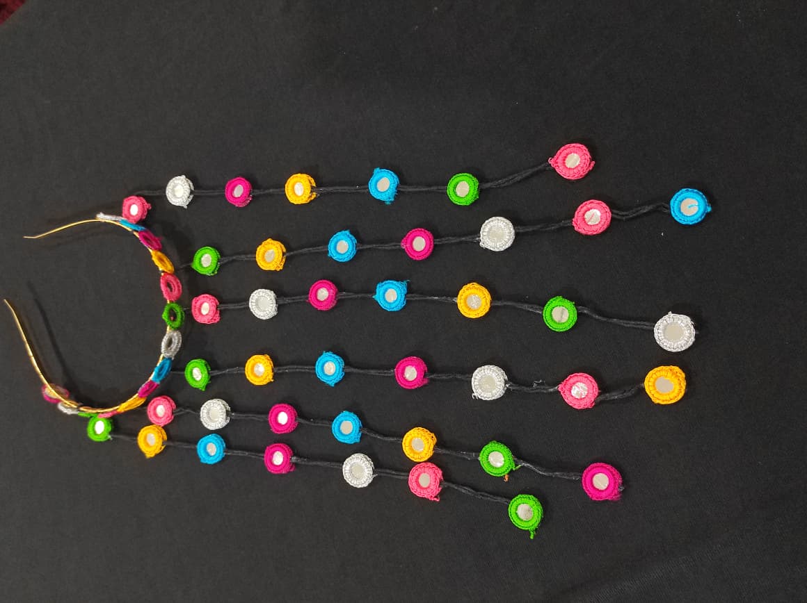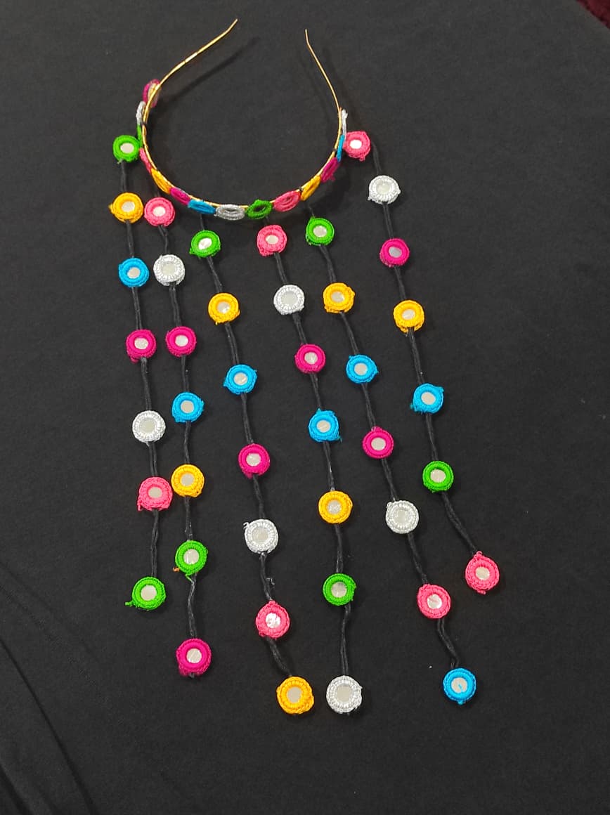 Celebrate Navratri with the A2 Fashion Multicolour Mirror Work Hair Accessory, designed to complement your festive garba attire. This vibrant hair band features intricate mirror work that adds sparkle and traditional charm to your look. Comfortable and stylish, it keeps your hair neatly in place while enhancing your overall ensemble, making it an ideal accessory for long hours of dance and celebration. Perfect for girls seeking a blend of cultural elegance and modern trend.